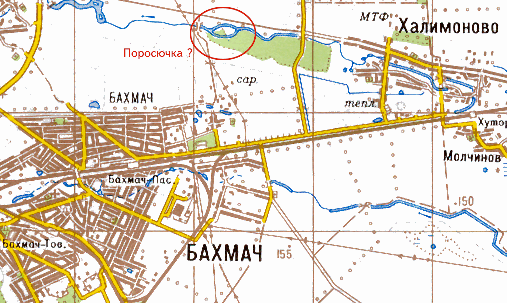 Розглядаючи карту околиць Бахмача 1:100000, видану у 2001 р., я знайшов місце, яке відповідає опису Цапенка. Це острів на річці за 3 км на північний схід від станції Бахмач-Пасажирський. Він на половину заріс лісом.