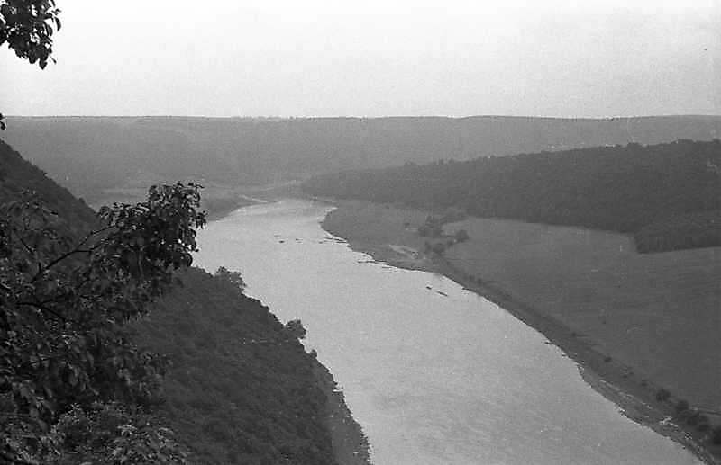 1988 р. Вид на Дністер з Червоної гориРозмір зображення: 800:517 піксел 1988 р. 20 червня. Фото М.І.Жарких. Негатека, № 409-10. |