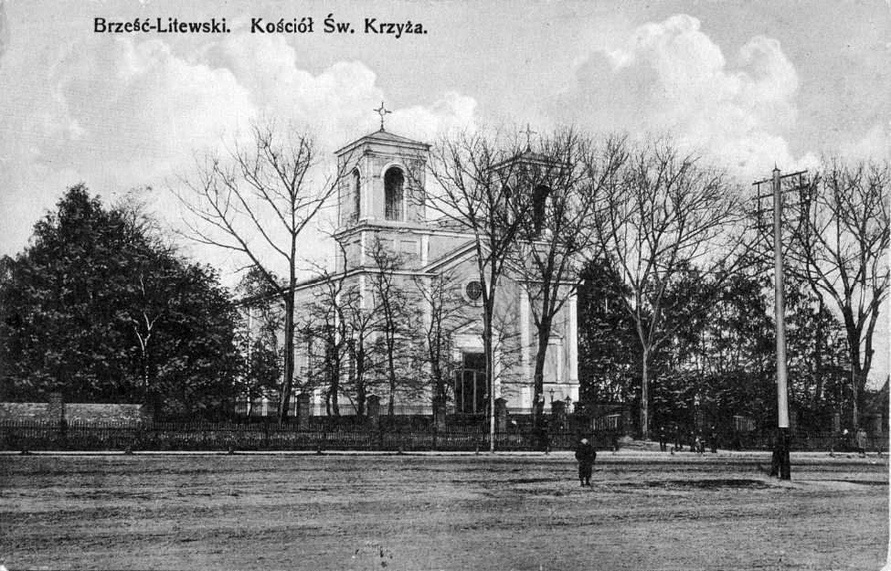 Поштівка: костел св. Хреста у Бересті. – Brześć-Litewski, kościół Św. Krzyża. Brest-Lit. : izdanie tabaĉnago i galant. magaz. Minca, [ante 1918] (pocztówka); 9 × 13 cm
