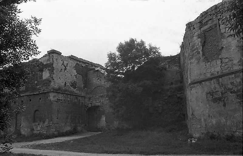 1988 р. Фрагмент башти 1, прясло 2 з брамою, фрагмент башти 3. Вигляд з північного сходуРозмір зображення: 800:515 піксел 1988 р. 16 червня. Фото М.І.Жарких. Негатека, № 401-38. |