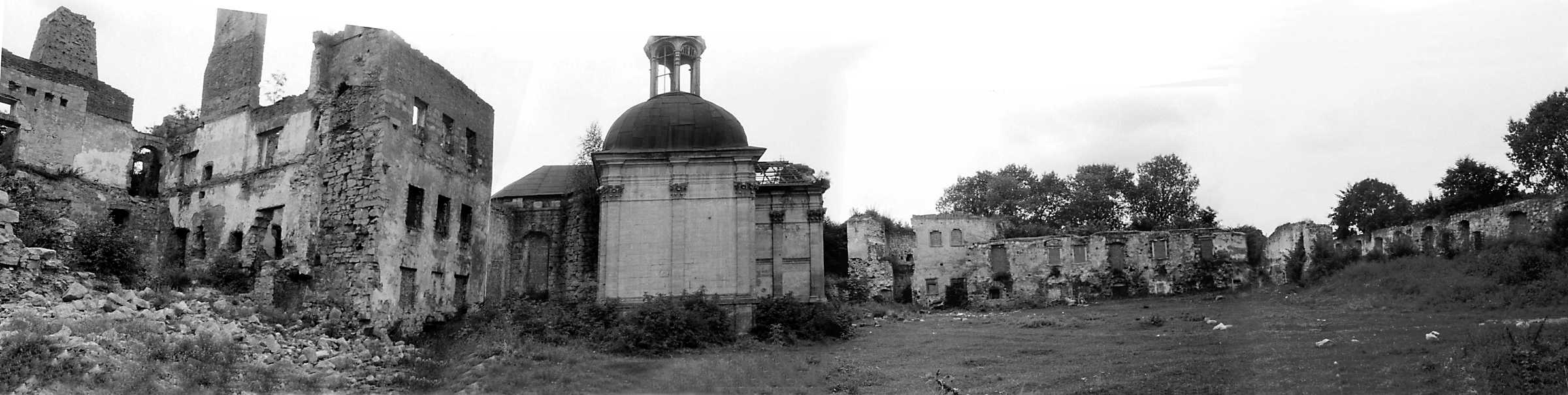 1991 р. Панорама двора з північного сходу: корпус 19, каплиця 17, башта 6, корпуси 15 та 13Розмір зображення: 2400:604 піксел 1991 р. 19 серпня. Фото М.І.Жарких. Негатека, № 730-22+5. |