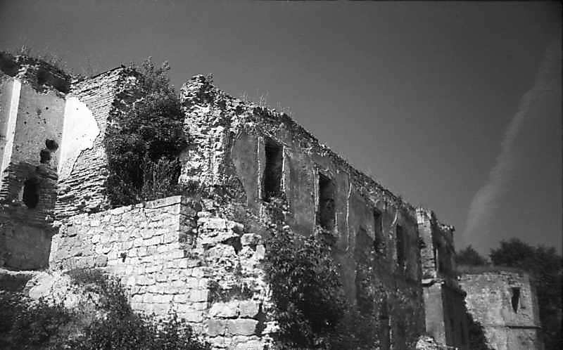 1977 р. Фрагмент башти 11, корпус 12, башти 1 і 3. Вигляд з південного сходуРозмір зображення: 800:498 піксел 1977 р. 25 липня. Фото М.І.Жарких. Негатека, № A338-17. |