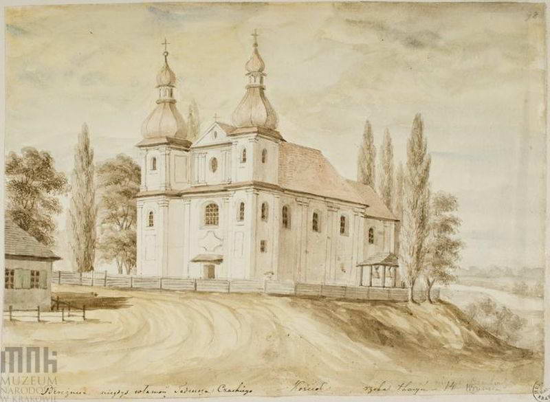 Kościół parafialny p.w. św. Rafała archanioła. Widok fasady i elewacji bocznej dwuwieżowego kościoła z wyodrębnionym prezbiterium. 1862—1876. Dat.: 14 Września. Napis: Bereżnica niegdyś własność Tadeusza Czackiego. Kościół; rzeka Horyń — Bereżnica niegdyś Czackich; napis na podkłade: G. Wołyńska. Bereżnica, Kościół. Rys. ołówkiem podmalowany akwarelą, 19,7x27,1. Ill-r.a. 4143 (Teka Wołyń). [Katalog rysunków architektonicznych ze zbiorów Muzeum narodowego w Krakowie. 1. Rysunki Napoleona Ordy / Opracowały Zofia Kucielska i Zofia Tobiaszowa. – Warszawa: Państwowe wydawnictwo naukowe, 1975, Nr. 41]