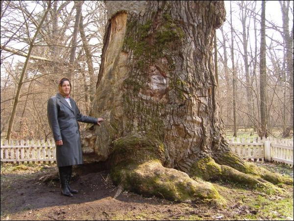 Валентина Рудниченко з села Березове Рокитнівського району Рівненщини біля найстарішого дуба в Україні. Дерево росте поблизу жіночого монастиря Іверської ікони божої матері.