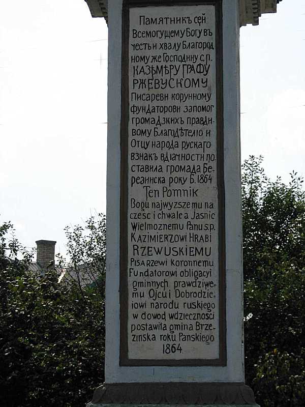 Напис: «Памятник сей всемогущему богу в честь и хвалу, благородному же господину с[лавной] п[амяти] Казимиру графу Ржевускому, писареви корунному, фундаторови запомог громадских, правдивому благодетелю и отцу народа руского в зняк вдячности поставила громада Березинска р. 1864». [Нижче повторено по-польськи.]
