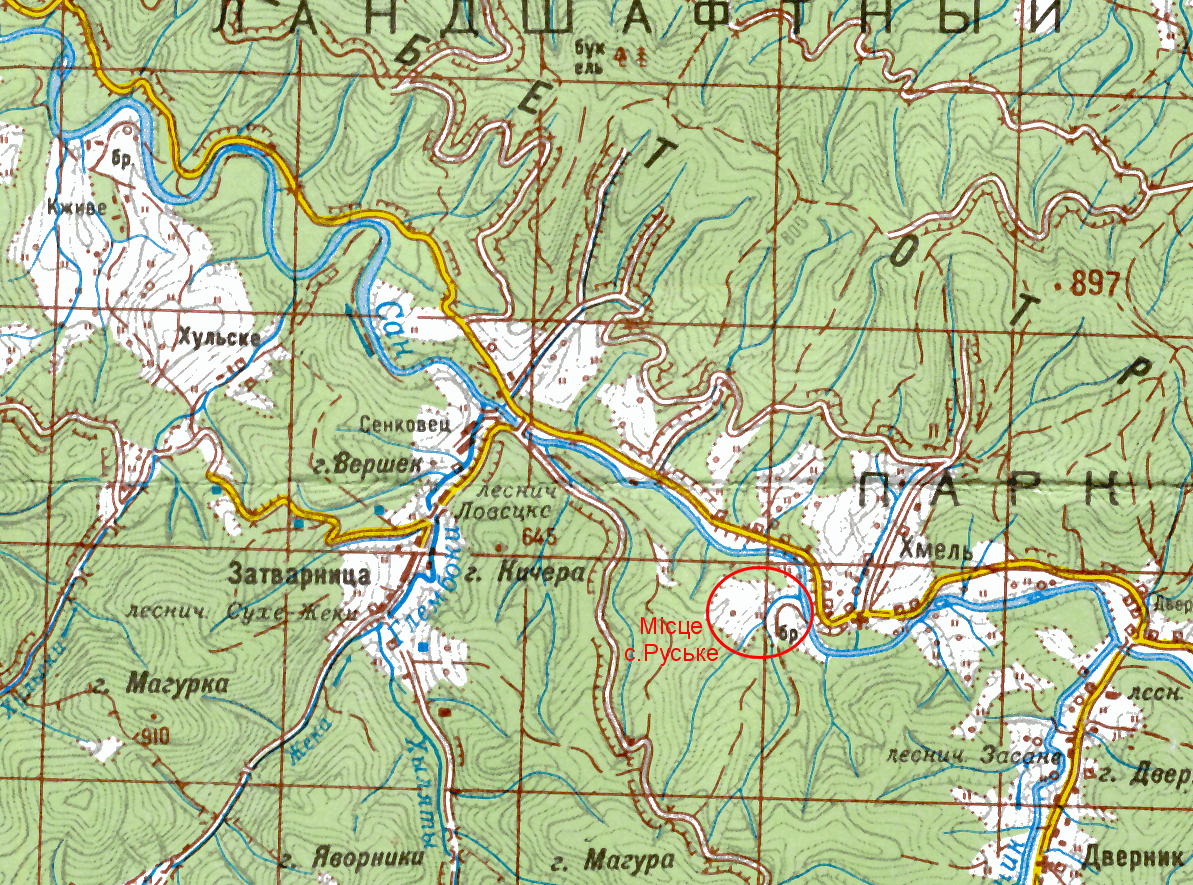 КартаРозмір зображення: 1193:885 піксел Карта Київської військово-картографічної фабрики, масштаб 1:100000, аркуш 125, друк 2001 р. (за матеріалами 2000 р.). |