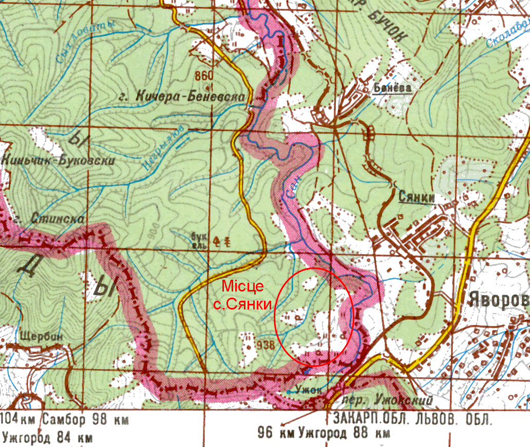 Сянки сРозмір зображення: 1032:871 піксел Карта Київської військово-картографічної фабрики, масштаб 1:100000, аркуш 125, друк 2001 р. (за матеріалами 2000 р.). Село належало до Турчанського деканату Перемиської єпархії. |