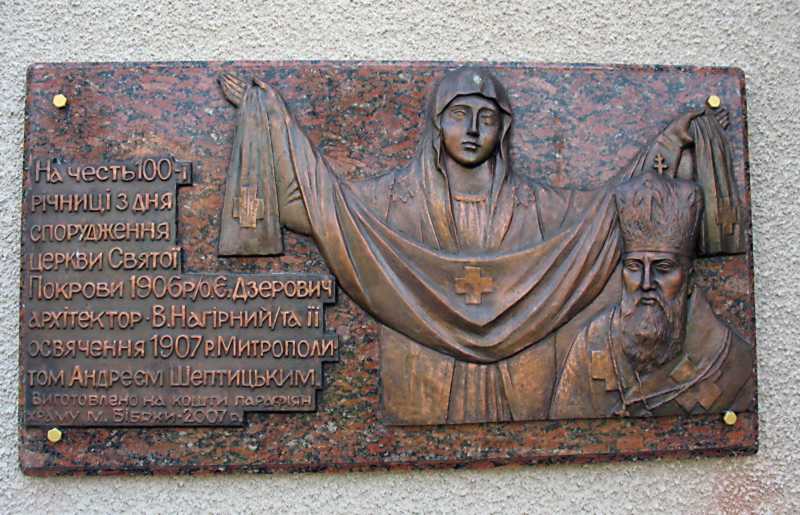 Напис: «На честь 100-ї річниці з дня спорудження церкви Покрови святої богородиці 1906 р. (о. Є. Дзерович, архітектор В. Нагірний) та її освячення 1907 р. митрополитом Антреєм Шептицьким. Виготовлена на кошти парафіян храму м. Бібрки 2007 р.»