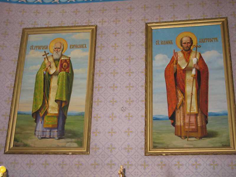 Ікони «Св. Григорій Богослов» та «Св. Іоан Златоуст»Розмір зображення: 800:600 піксел Фото Зенона Боровця і Богдана Тхора, 10 серпня 2006 р. Григорій Богослов – ліворуч. |