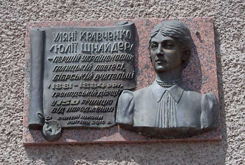 Напис: «Уляні Кравченко (Юлії Шнайдер) – першій україномовній галицькій поетесі, бібрській вчительці (1881 – 1884 рр.), громадській діячці у 150 річницю від народження. Вчителі школи, квітень 2010 р.»