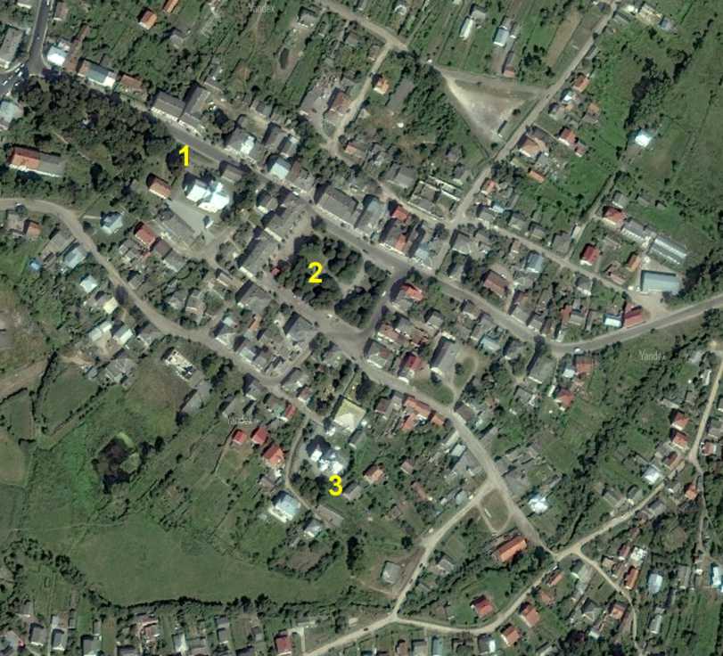 Центр містечка на космічному фотоРозмір зображення: 811:736 піксел Центр містечка на космічному фото Яндекс 1 – костел св. Миколи; 2 – ринкова площа; 3 – церква Покрови. |