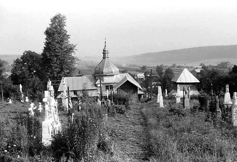 1990 р. Церква і дзвіниця в панорамі села. Вигляд з півдня
