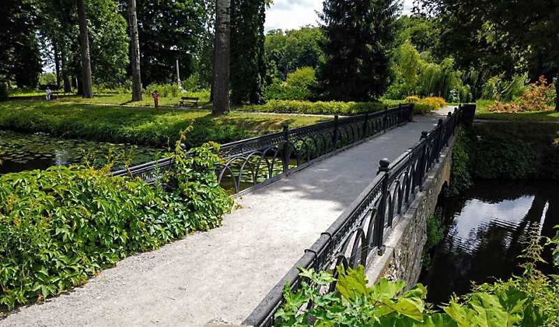 Арковий міст (однопрогоновий, мурований) у південній частині парку зв’язує берег водойми з півостровом. Його довжина – 21 м, ширина – 2 м. Розташований з урахуванням найсприятливіших точок візуального сприйняття краєвиду. Джерело: Пам’ятки архітектури та містобудування України. – К.: Техніка, 2000 р., с. 129.