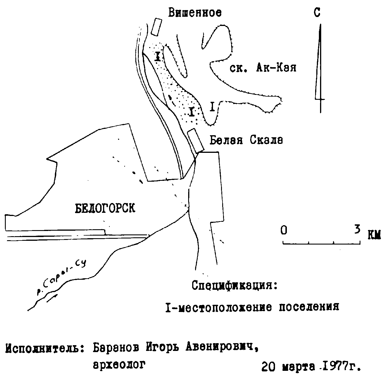 Поселення розташоване на крутому південно-західному схилі Ак-Кая. Площа поселення 3,5х0,5 км. Культурний шар сильно розмитий. В промоїнах зустрічаються багаточисельні уламки розписних йонохой баклинського типу та північно-причорноморських амфор VIII-X ст. Разом з ними знайдені фрагменти сіроглиняних горщиків салтово-маяцького типу.
