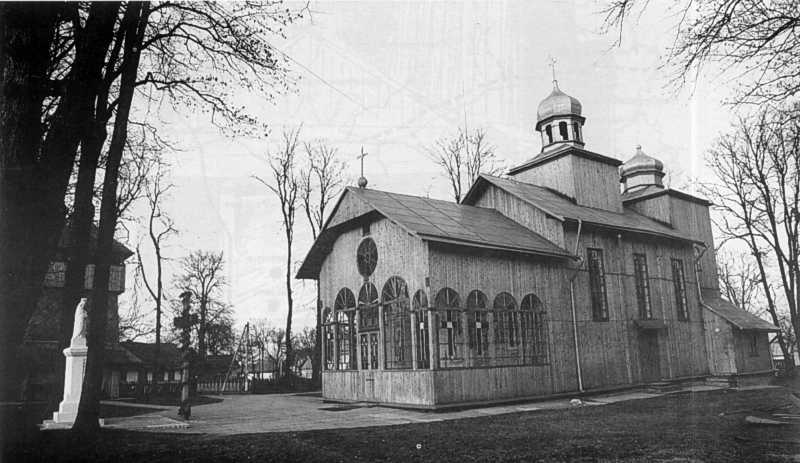 В 1515 р. в селі вже була парафіяльна церква. Наступна дерев’яна походила з 1667 р. і проіснувала до 1872 р. У 1885 р. (за іншими даними у 1881) зведено дерев’яний двоверхий храм. Четверик нави вкритий пірамідальним низьким наметом з ліхтарем і маківкою. З двосхилого даху бабинця здіймається четверикова вежа, вкрита таким же наметом. По другій світовій війні була діючою.