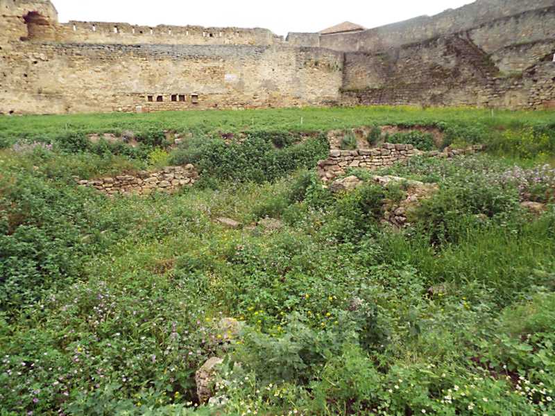 Ліворуч – башта 32, від неї направо йде східний мур зовнішнього поясу оборони. Далі направо – дах башти 1 і східна частина середнього муру. Фото Івана Парнікози, 20 червня 2021 р.