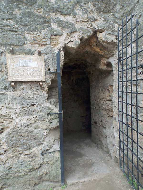 2021 р. Вхід до башти 26Розмір зображення: 600:800 піксел Фото Івана Парнікози, 20 червня 2021 р. Напис на табличці: «Башта-темниця». |