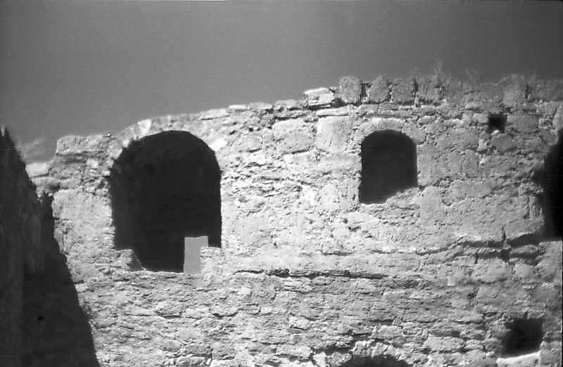 1995 р. Фрагмент верхнього ярусу північного муру. Вигляд з півдняРозмір зображення: 800:522 піксел 1995 р. 23 серпня. Фото М.І.Жарких. Негатека, № 883-23. |
