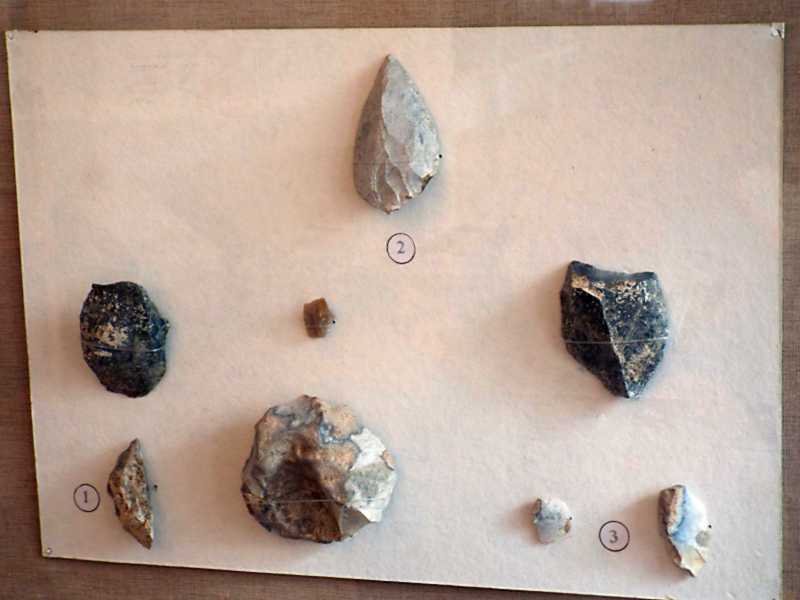 Ліворуч (1) – кременеві знаряддя праці неандертальців та відходи їх виробництва, знайдені в 1963 р. на південно-західній околиці Білгорода-Дністровського. Їх вік – 50 до 100 тис. років.