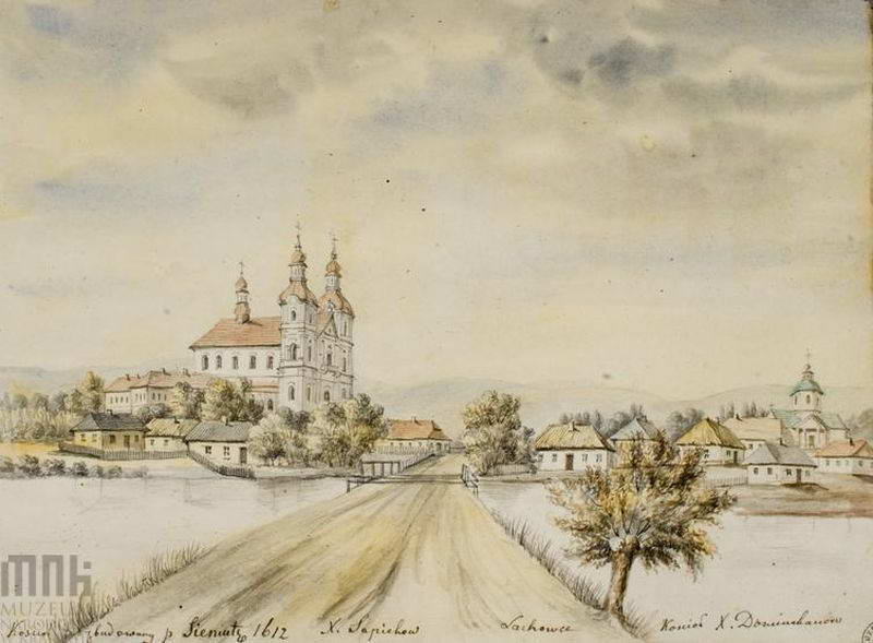 Kościół Dominikanów i kościół parafialny. Widok od strony rzeki Horyń. Z lewej strony kościół dwuwieżowy z sygnaturką; obok budynki klasztorne; z prawej strony kościół parafialny z kopułą na wielobocznym bębnie i portykiem kolumnowym. Napis: Kościół zbudowany p. Sieniutę 1612; X Sapiehów; Lachowce; Kościół X. Dominikanów; napis na podkładzie: Wołyń lachowce, – Kościół paraf. i Dominikanów. 1862-1876. Rys. ołówkiem podmalowany akwarelą. 20,5 x 27,8 cm. Muzem Narodowe, Kraków. III-r.a. 4184 (Teka Wołyń). [Katalog rysunków architektonicznych ze zbiorów Muzeum narodowego w Krakowie. 1. Rysunki Napoleona Ordy / Opracowały Zofia Kucielska i Zofia Tobiaszowa. – Warszawa: Państwowe wydawnictwo naukowe, 1975, Nr. 376]