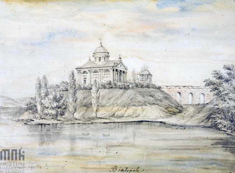 Замчище із костелом у с. Білопілля. Рисунок Наполеона Орди 1860 – 1870-х рр. [Праворуч – замковий міст ще стояв.]