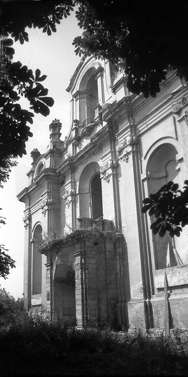 1993 р. Головний фасад. Вигляд з північного сходуРозмір зображення: 599:1200 піксел 1993 р. 19 липня. Фото М.І.Жарких. Негатека, № 817-18+9. |