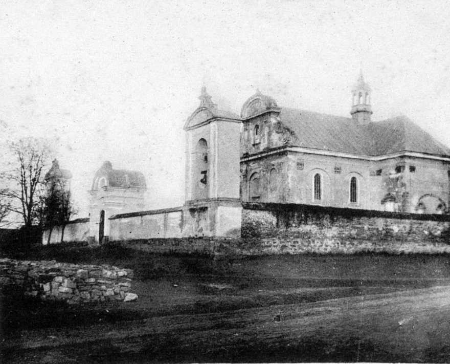 1910 р. Загальний вигляд з позиції А3Розмір зображення: 880:711 піксел Поштівка: костел у Білому Камені. – Kościół par. łac. w Białym Kamieniu. [S.l. : s.n., ca 1910] (Lwów ; Z ko. R pr. «Tęcza») (pocztówka); 9 × 14,1 cm |