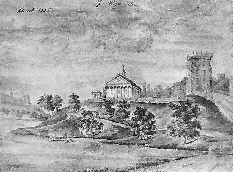 Ruiny zamku Koreckich i kościół parafialny p.w. św. Jana Nepomucena. Widok od strony rzeki. Na wysokim brzegu pozostałości murów obronnych z czworokątną basztą zwieńczoną krenelażem; w obrębie murów kościół z kolumnadą i trójkątnym przyczółkiem w fasadzie; z lewej dwuarkadowa dzwonnica. Sygn.: N. Orda. Napis: Kościół na Zamczysku Białołówka; napis na podkładzie: G. Kijowska Biała Cerkiew [!], – ruiny zamku; napis na kartce doklejonej do podkładu: Białołówka Zamek obronny założony w XVII wieku przez Annę z Chodkiewiczów Korecką dla schronienia uciekającym rodakom z niewoli pogańskiej. W ostatnich czasach należała do Hr Potockiego Starosty Szczyrzeckiego. 1870 Rys. ołówkiem podmalowany akwarelą. 19,4 x 26,1 cm. Muzeum Narodowe, Kraków. III-r.a. 2841. (Teka Ukraina). [Katalog rysunków architektonicznych ze zbiorów Muzeum narodowego w Krakowie. 1. Rysunki Napoleona Ordy / Opracowały Zofia Kucielska i Zofia Tobiaszowa. – Warszawa: Państwowe wydawnictwo naukowe, 1975, Nr. 51]