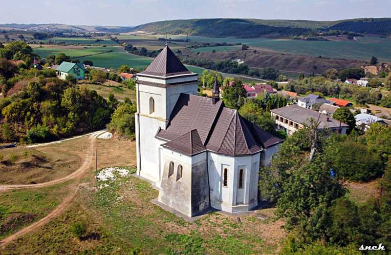Костел орієнтація вівтаря 85° в центрі села на головної вулиці, на земляному замчищі на правому березі Золотої Липи. Спостереження М.І.Жарких, 19 серпня 1991 р.