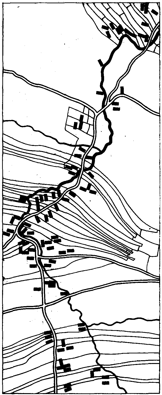 З кадастральних карт сіл Волосянка та Бітля видно, що у тих випадках, коли схили гір виходили до річки, поселення розташовані вздовж рік переривчасте, групами дворів. До річки прилягає вузька дорога, частина поселення розташована вздовж неї, а більшість – уздовж річки. Інша частина поселення розташована також уздовж двох потічків, які впадають у річку, між потічками і житлом також утворюється дорога. Більшість хат фасадами орієнтована на південь, південний схід, переважно довгим боком до річки.