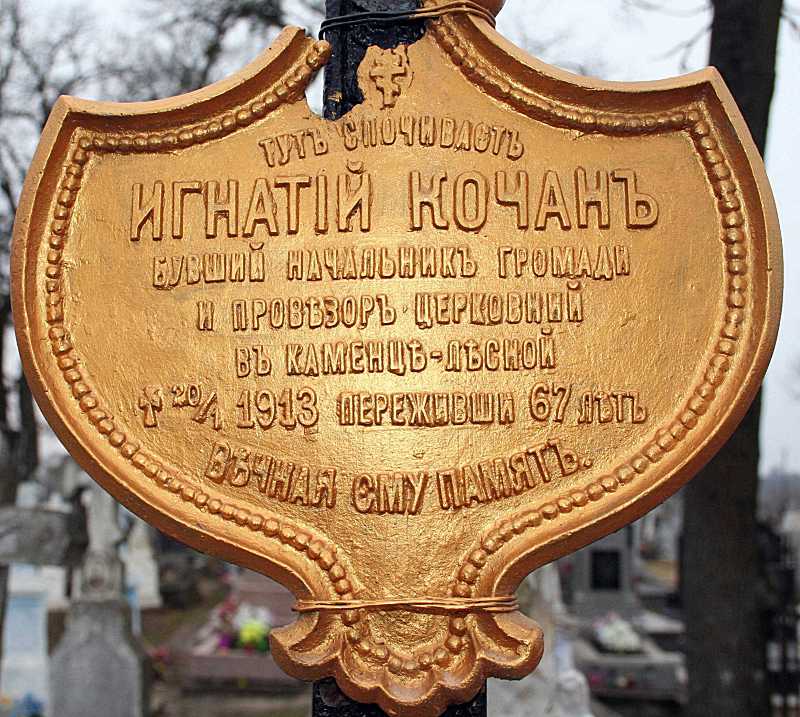 Напис: «Тут спочиваєт Ігнатій кочан, бувший начальник громади і провізор церковний в Каменце-Лесной. + 20.01.1913, переживши 67 лест. Вечная єму память».