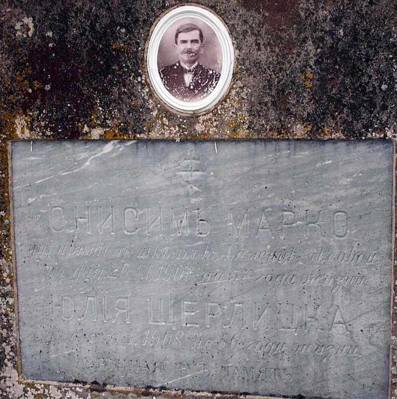 Напис: «Онисим Марко, управитель школи в Каменці Лісовій уп[окоївся] дня 20.06.1907 на 57 году жизни. Ллія Шерлицька уп. 31.01.1908 на 86 году жизни. Вічна їм пам’ять».