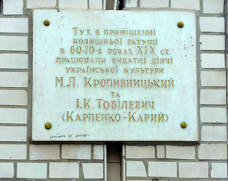 Напис: «Тут, у приміщенні колишньої ратуші, в 60-70-х роках 19 ст. працювали видатні діячі української культури М. Л. Кропивницький та І. К. Тобілевич (Карпенко-Карий)».