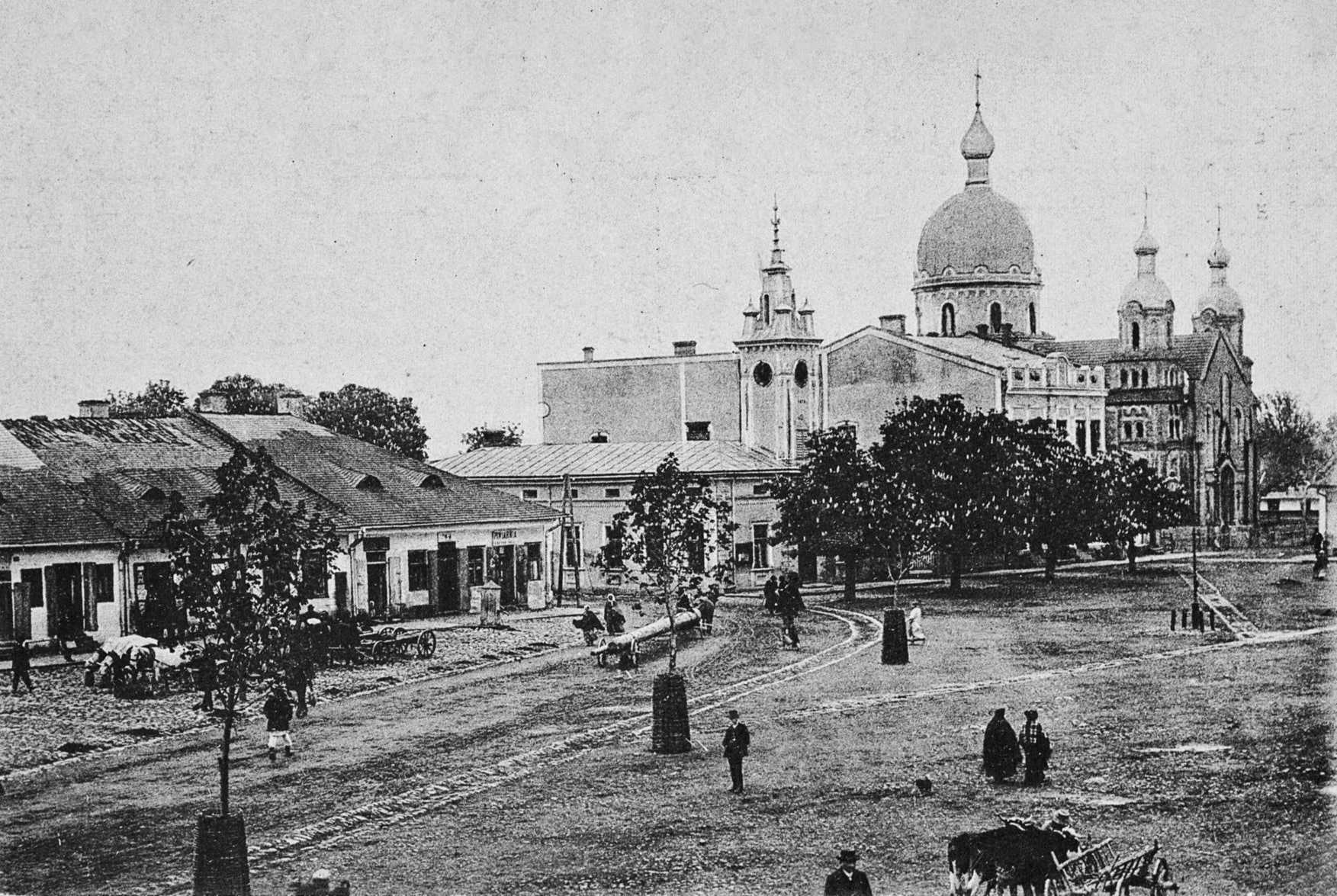 Посередині ратуша, за нею – 2-поверховий будинок і церква. Фото 1910 р. опубліковано на сторінці «Мандрівка старим кордоном» 30.01.2022 р.