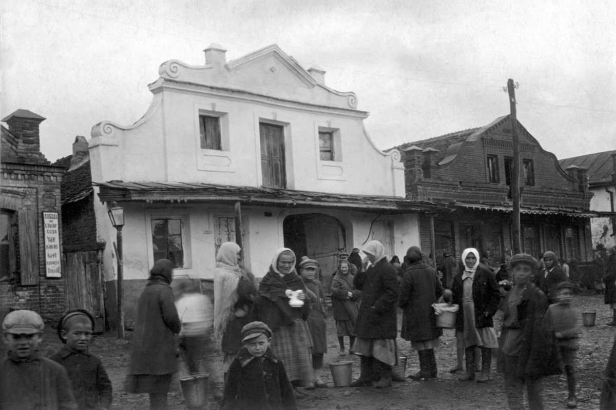 Ліворуч на будинку видно вивіску: «Победа Сахар Сода Чай Какао Кофе Конфте Шоколад» (прецінь російською мовою!).