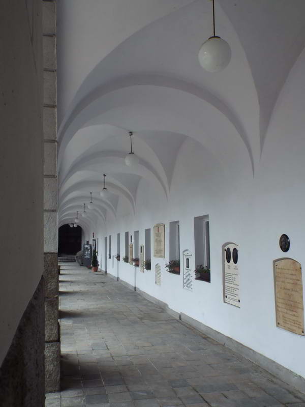 Collegium Hosianum – перша єзуїтська школа у Польщі, в якій навчалися майбутні уніатські митрополити і єпископи. Галерея з меморіальними дошками відомих випускників. Тут бракує дошок на честь українських уніатських діячів. Фото Івана Парнікози, 13 серпня 2013 р.