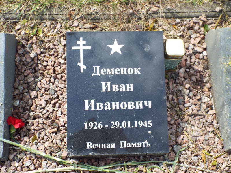 Військове кладовище радянських солдат у м. Бранево. Похованння Деменока Івана івановича (1926-29.01.1945 р.). Фото Івана Парнікози, 30 квітня 2015 р.