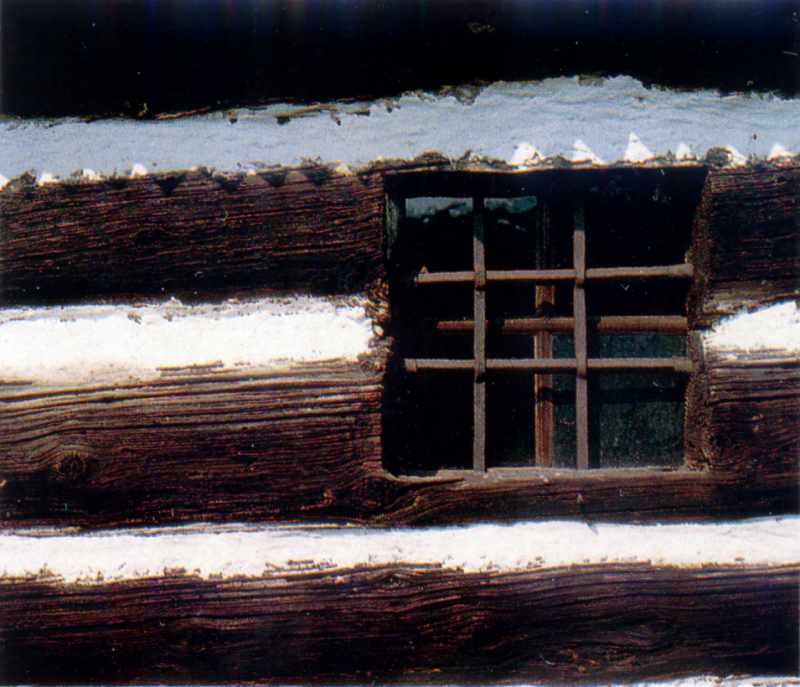 ВікноРозмір зображення: 800:687 піксел Типове віконце, яке виникло наслідком глибоких зарубин в двох сусідніх балках зрубу. Засклений отвір оснащений простими гратками. |