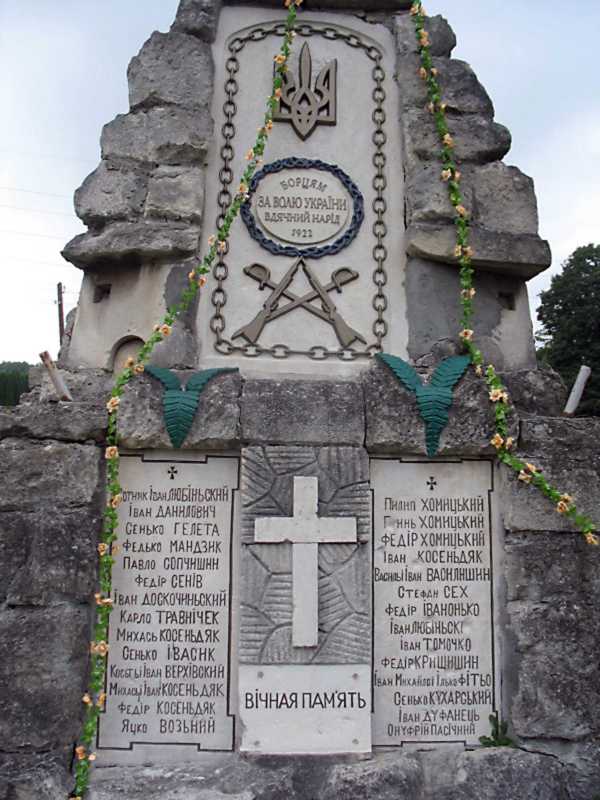 Чільний бік обеліска Розмір зображення: 600:800 піксел Фото Зенона Боровця і Богдана Тхора, 9 липня 2014 р. Вкладені елементи Верхня плита з написом Нижні плити з іменами воїнів