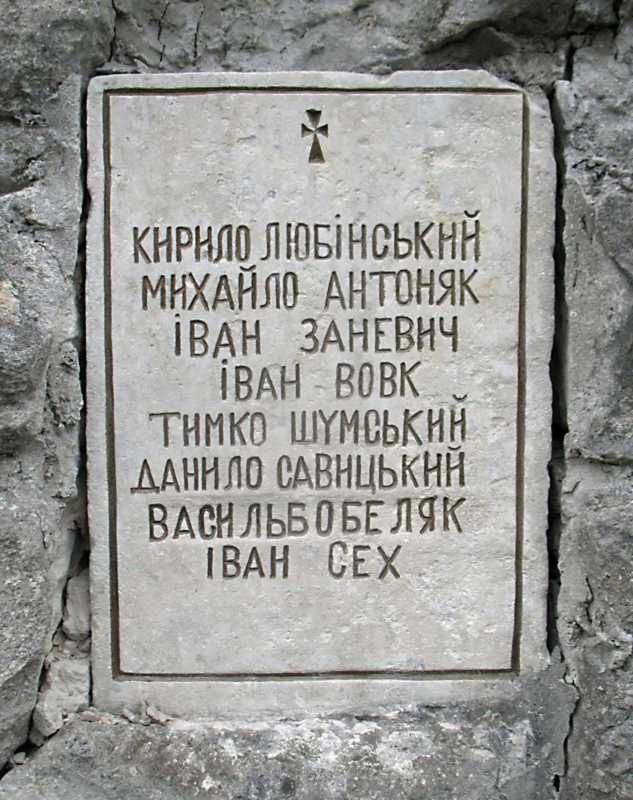 Плита 3 з іменамиРозмір зображення: 633:800 піксел Фото Зенона Боровця і Богдана Тхора, 9 липня 2014 р. Напис: «Кирило Любінський Михайло Антоняк Іван Заневич Іван Вовк Тимко Шумський Данило Савицький Василь Бобеляк Іван Сех» |