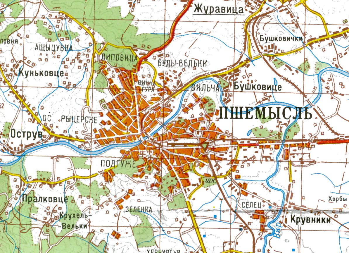 Карта (Бушковіце)Розмір зображення: 1194:865 піксел Карта Київської військово-картографічної фабрики, масштаб 1:100000, аркуш 88, друк 2000 р. (за матеріалами 2000 р.). |