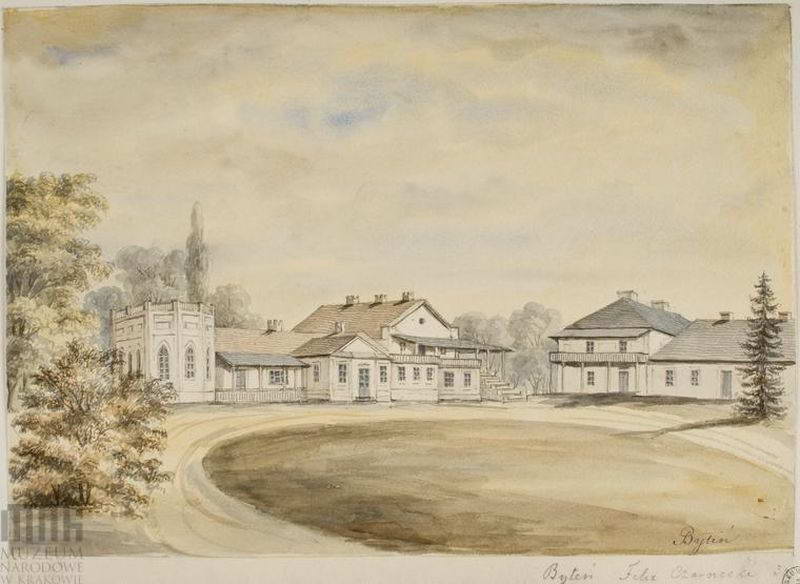 Dwór Czarneckich. Widok od strony podjazdu. Dwór parterowy z obudowanym gankiem, wielo… pawilonem z ostrołukowymi oknami z lewej strony i dwukondygnacjową oficyną… i schodami zewnętrznymi z prawej strony; obok budynki gospodarcze. 1862 – 1876. Napis: Byteń. Byteń Fełix Czarnecki 30; napis na podkładzie: Wołyń. Byteń; dwór. Rys. ołówkiem podmalowany akwarelą, 21,5x28,6. III-r.a. 4150 (Teka Wołyń). [Katalog rysunków architektonicznych ze zbiorów Muzeum narodowego w Krakowie. 1. Rysunki Napoleona Ordy / Opracowały Zofia Kucielska i Zofia Tobiaszowa. – Warszawa: Państwowe wydawnictwo naukowe, 1975, Nr. 98]