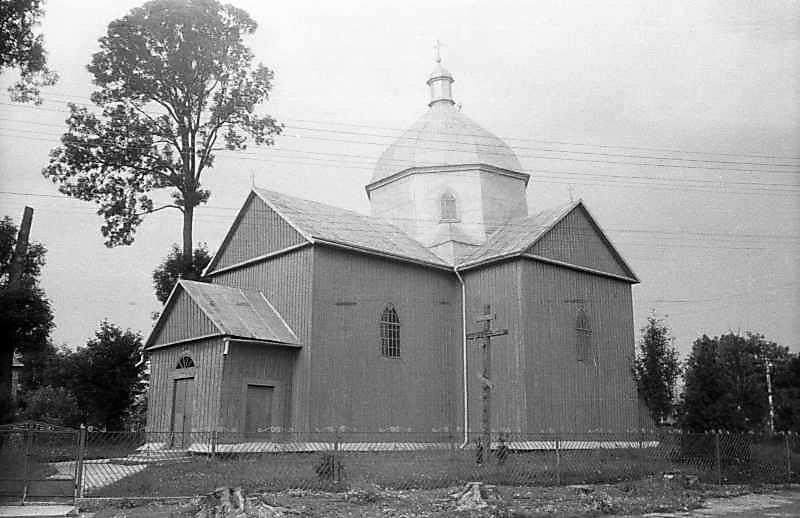 Дерев.церква в центрі села, вівтар 90°, до головної вулиці А3, дерев. дзвіниця С3. Спостереження М.І.Жарких, 7 серпня 1997 р.