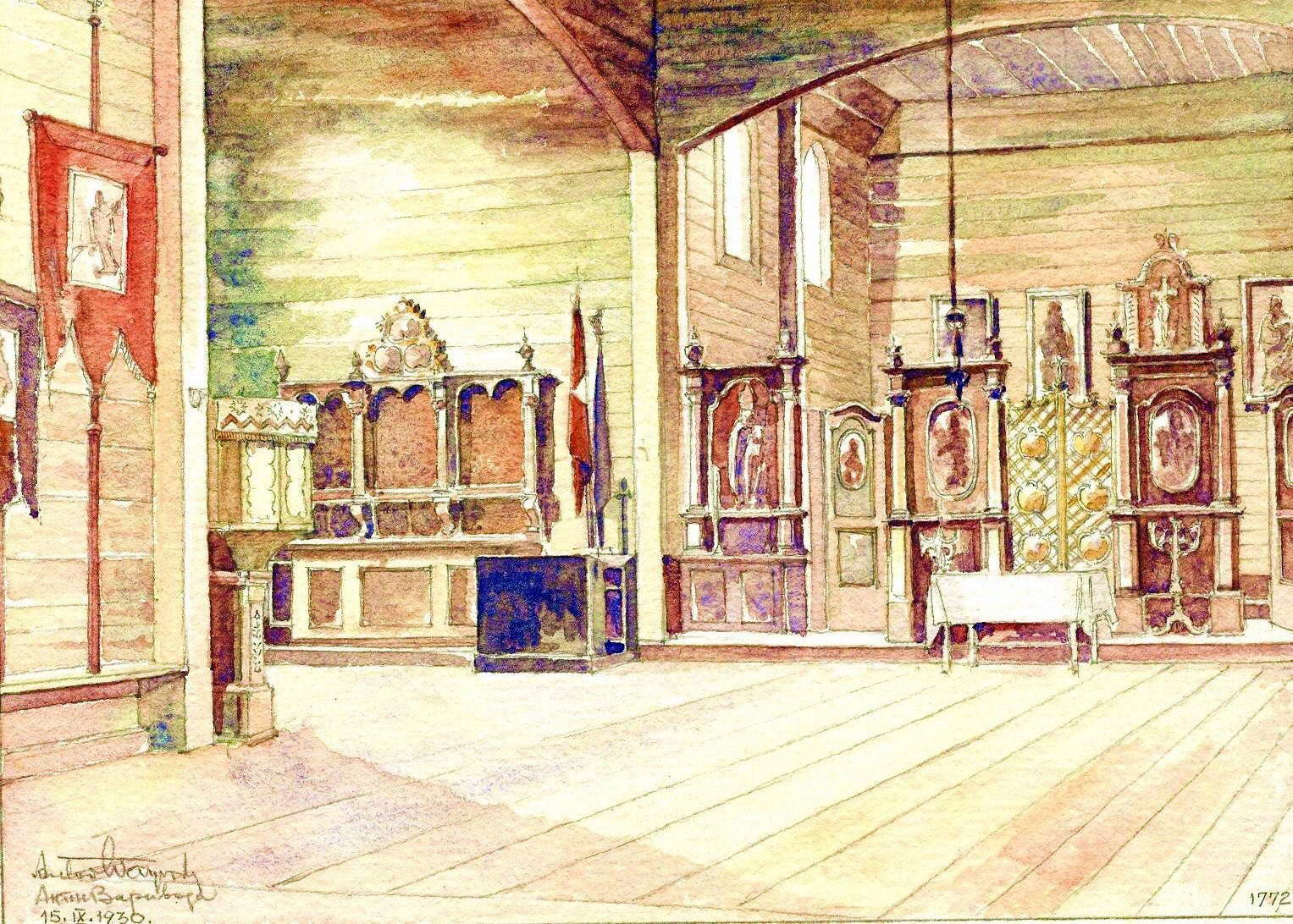 1772 Church, Fereskulya (Fereskula), Kolomiya, Ukraine. Interior view showing ceiling contruction, side altar, and the iconostasis at the main altar.