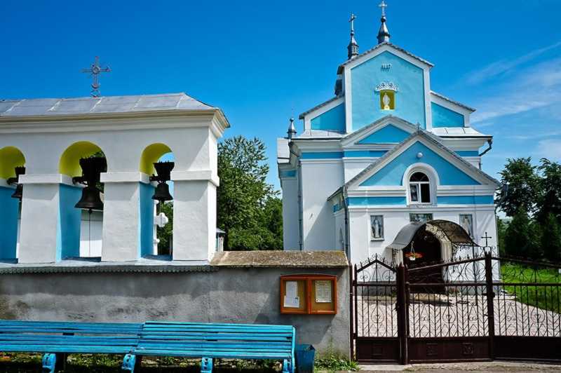 Церква 1817 р.: орієнтація вівтаря 110°, головний вхід – С4, до бічної вул. – С3, дзвіниця – А4, каплиця – А1, в центрі м-ка не на цвинтарі. Спостереження М.І.Жарких, 24 червня 1992 р.