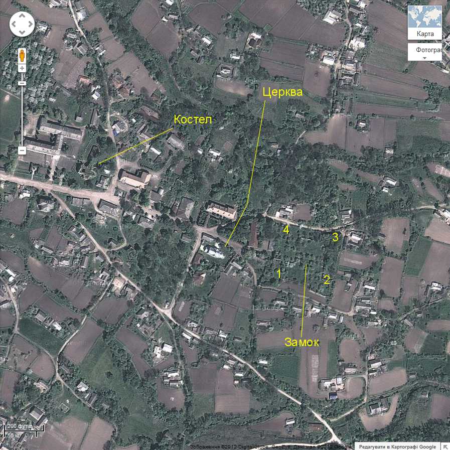 Космічне фото Google, 2013 р.Розмір зображення: 897:897 піксел 1 – 4 – бастіони замку: 1 – південно-західний; 2 – південно-східний 3 – північни-східний 4 – північно-західний |