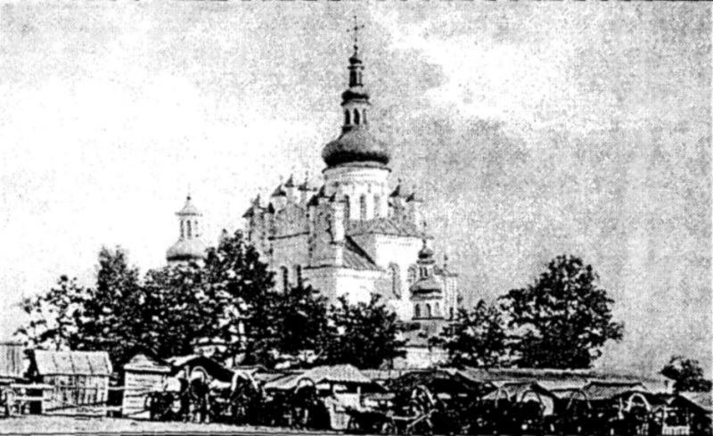 1903 р. Загальний вигляд з південного заходуРозмір зображення: 800:489 піксел Джерело: Віроцький В.Д. Храми Чернігова. – К.: Техніка, 1998 р., с. 129. |