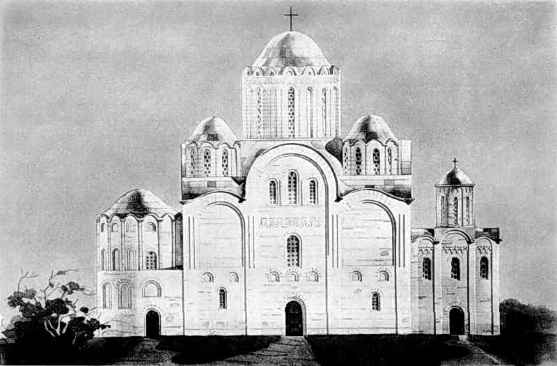 Вигляд із заходу. Реконструкція Ю. С. АсеєваРозмір зображення: 800:525 піксел Спаський собор у Чернігові. 1036 р. Реконструкція Ю. С. Асеєва. Джерело: Історія українського мистецтва. – К.: Наукова думка, 1966 р., т. 1, с. 165. |