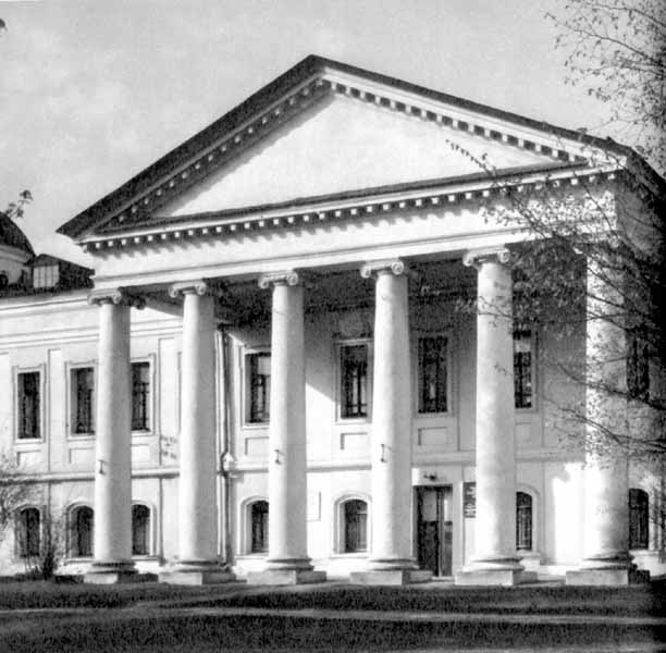 Эта классическая постройка была переделана из архиерейского дома, построенного в 1760 г. Главный вход с западного фасада был перенесен на восточный, тогда же был сделан и шестиколониый портик ионического ордера. Вытянутый с севера на юг двухэтажный корпус имеет полуподвальный этаж, благодаря чему он не выглядит приземистым. Планировка его очень простая: две продольные и четыре поперечные стены членят здание на ряд помещений.