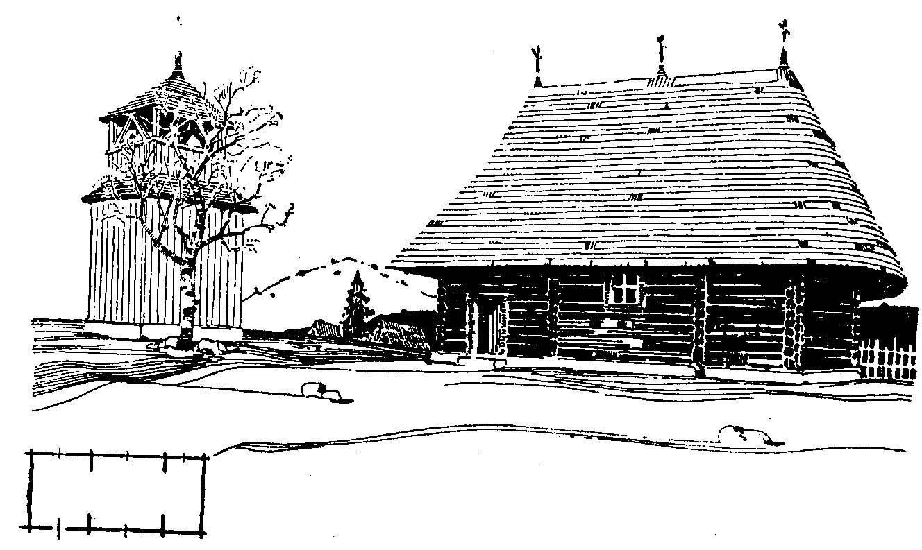 План і загальний виглядРозмір зображення: 1328:793 піксел Джерело: Юрченко П.Г. Дерев’яне зодчество України. – К.: 1949 р., с. 83. |